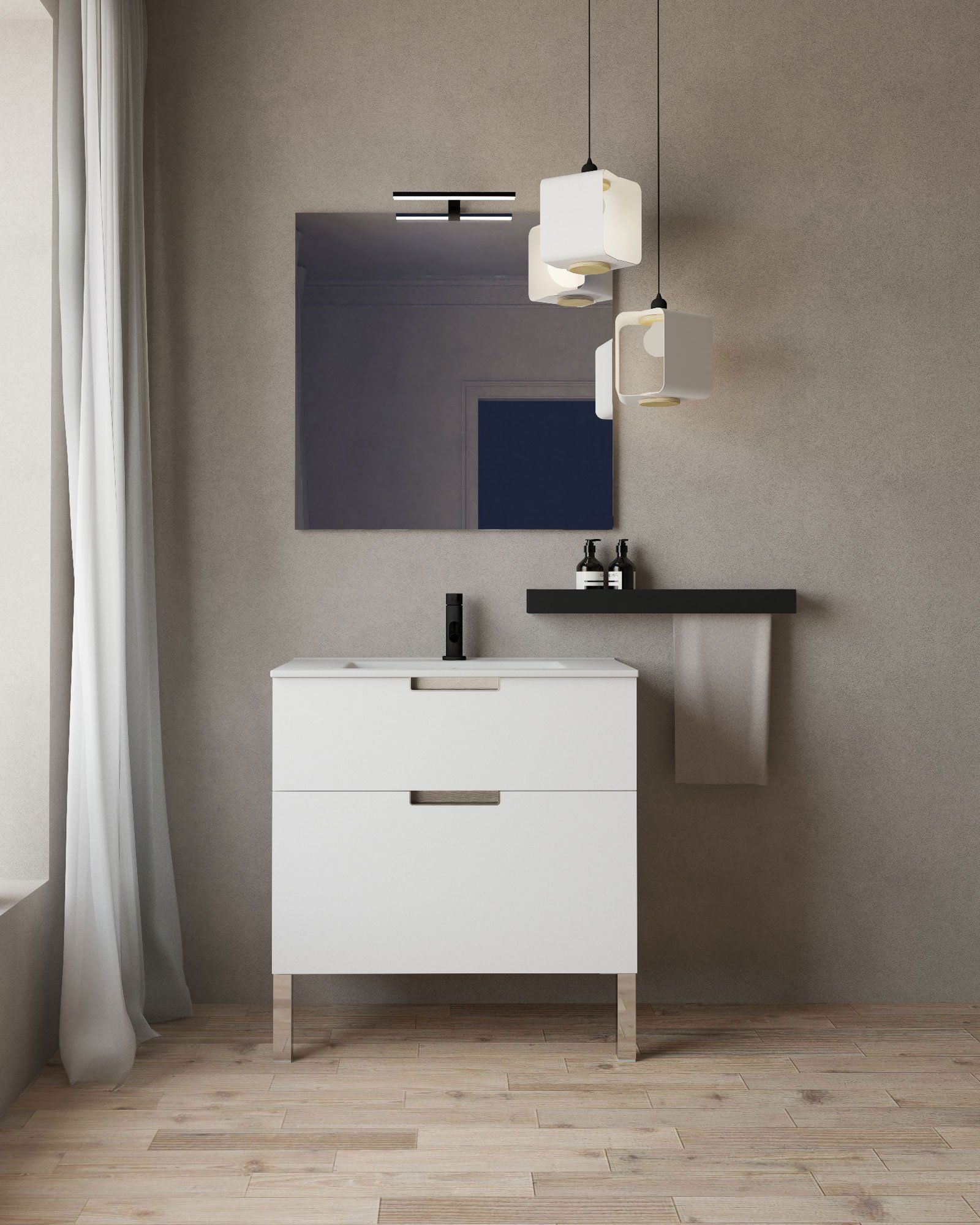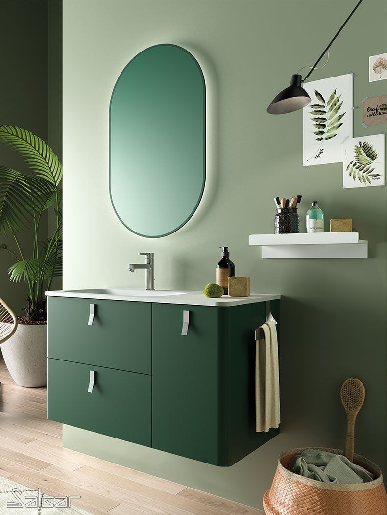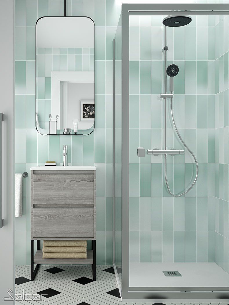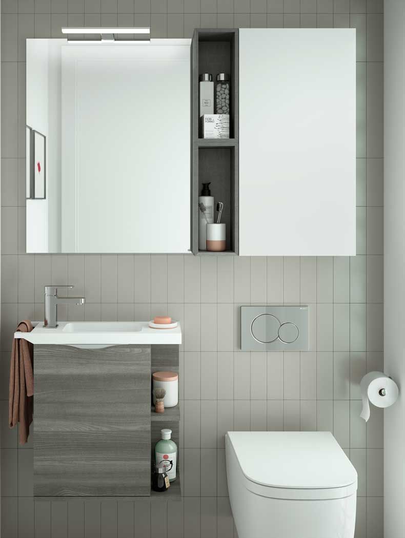 Al no llegar al suelo ni tener patas, los muebles colgados en el baño permiten ampliar la sensación espacial