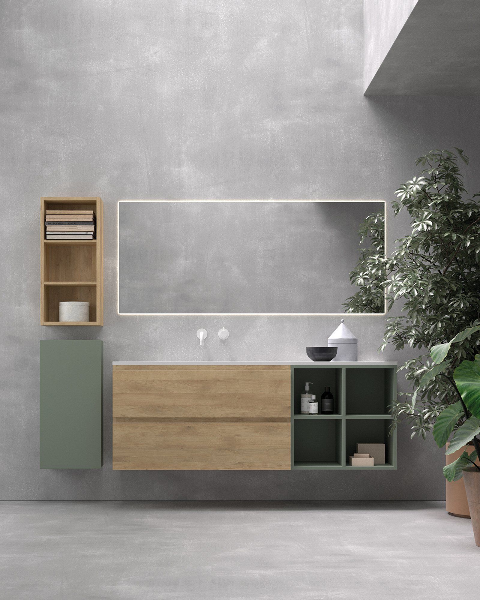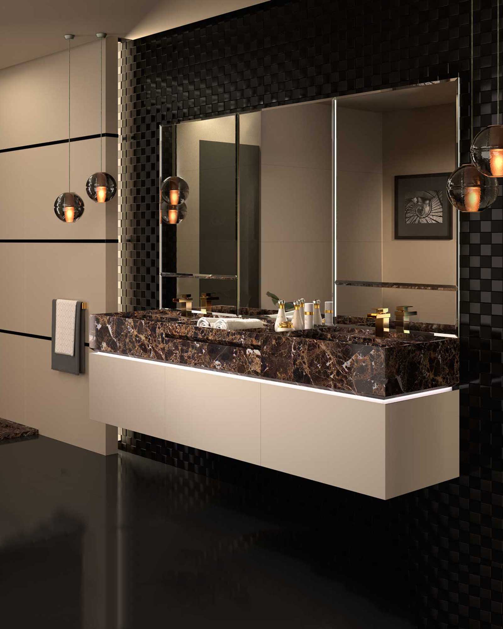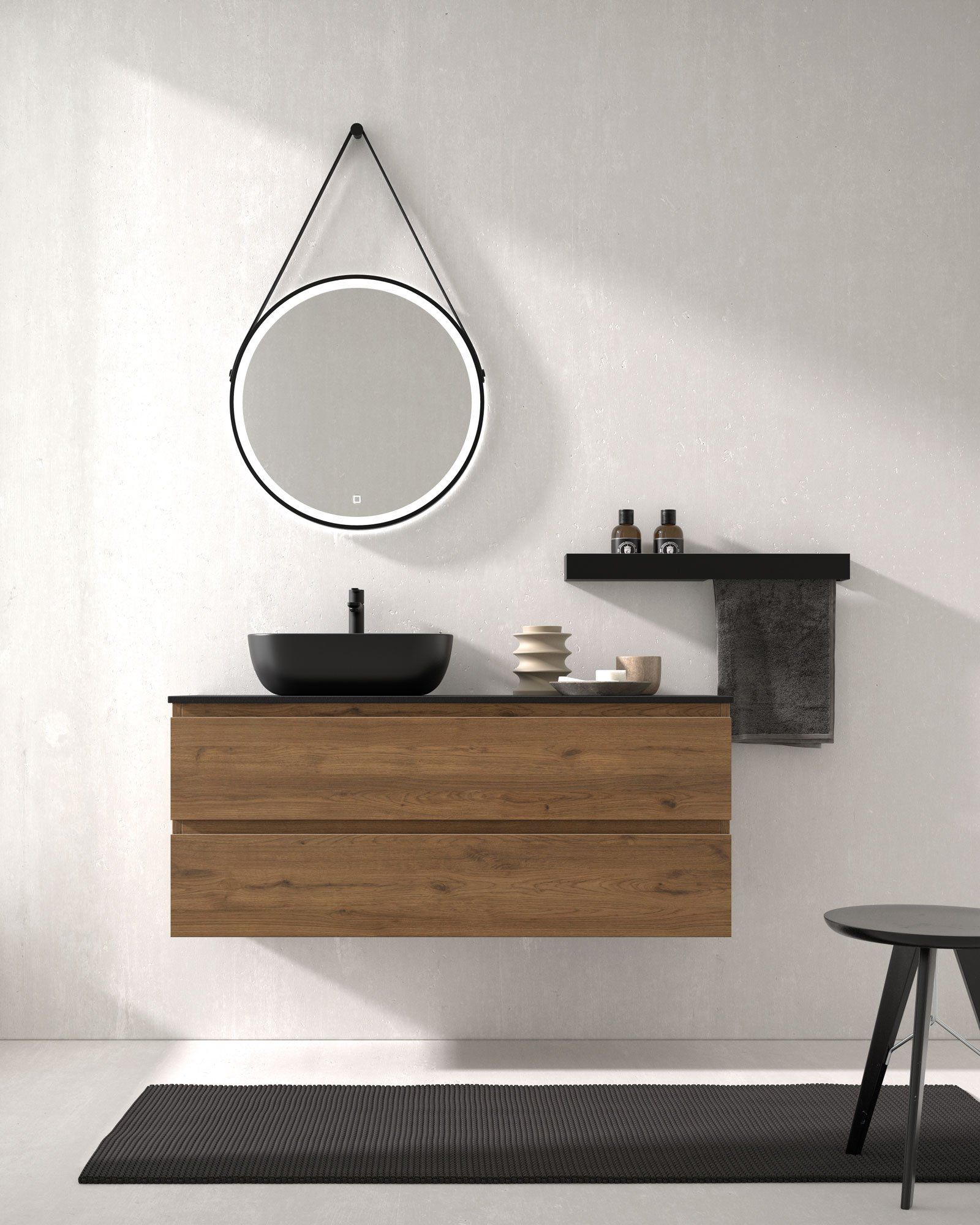 Al no llegar al suelo ni tener patas, los muebles colgados en el baño permiten ampliar la sensación espacial