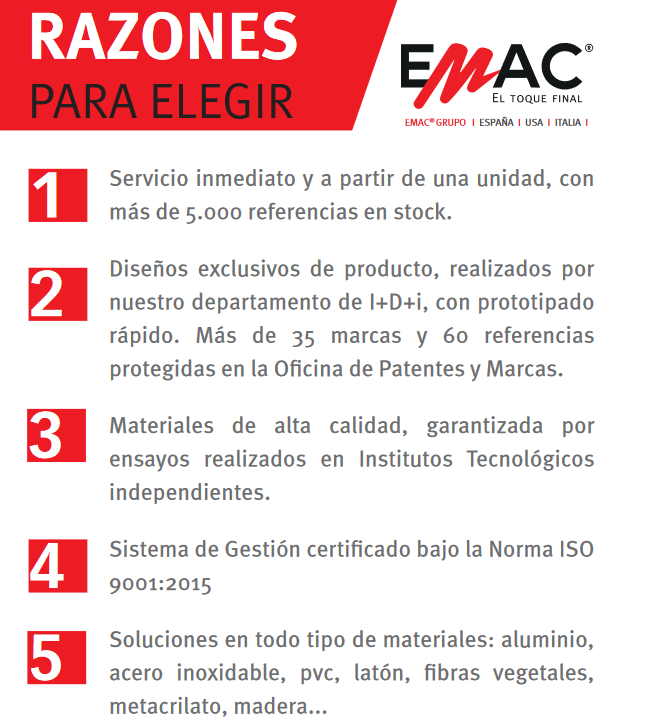 EMAC dispone de la más amplia gama del mercado en perfiles y complementos para pavimentos y revestimientos cerámicos. Soluciones de aluminio, acero inoxidable, madera natural, pvc, latón, fibras vegetales, corcho, metacrilato… de la más alta calidad, para darle el Toque Final a cualquier pavimento, revestimiento, escalera…