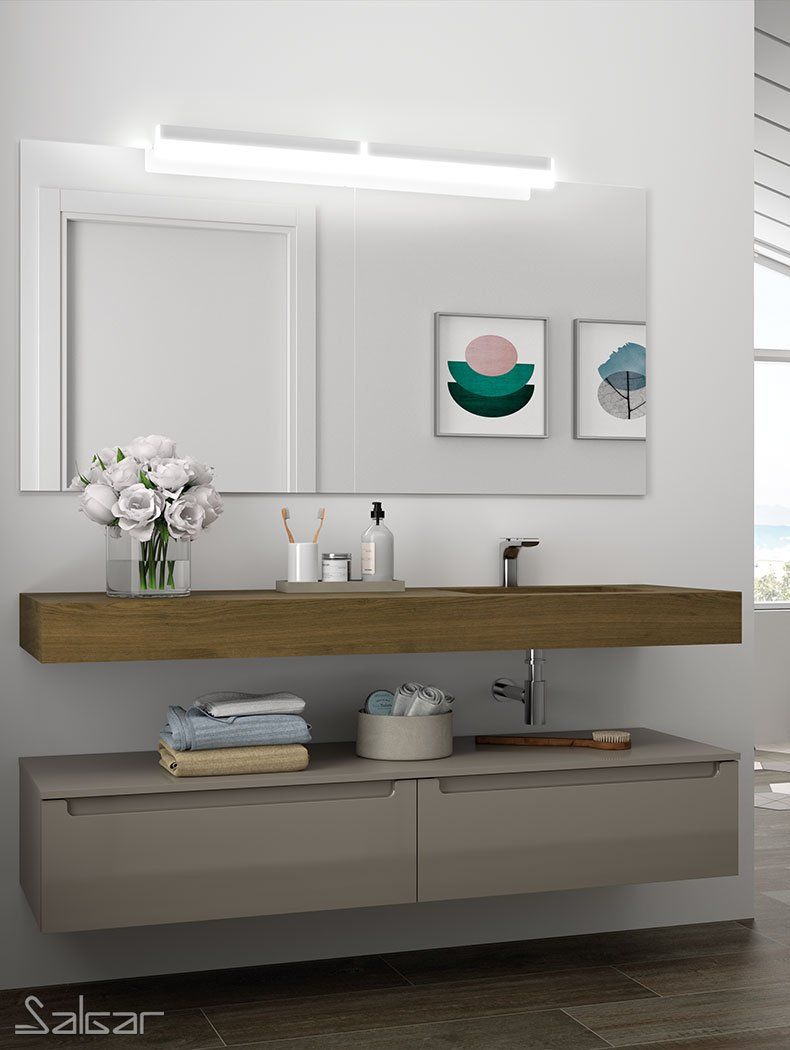 Al no llegar al suelo ni tener patas, los muebles colgados en el baño permiten ampliar la sensación espacial